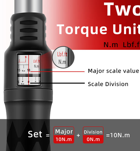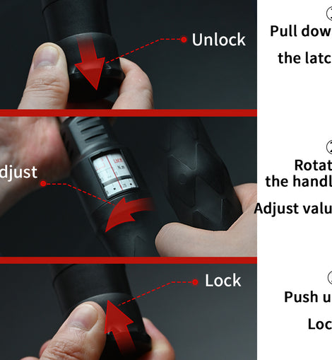 • 【Easy to Feel 'Click'】Pull down the lock knob and hold it until the torque setting is completed. Release the hand, the lock knob will automatically rebound back to lock the value. You will feel or hear a ‘click’ from the torque wrench when the preset torque value is reached to remind you not to apply any more force.