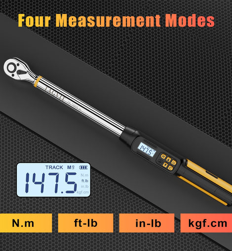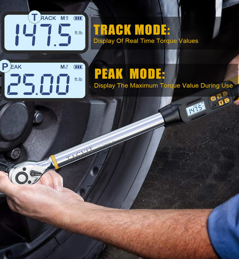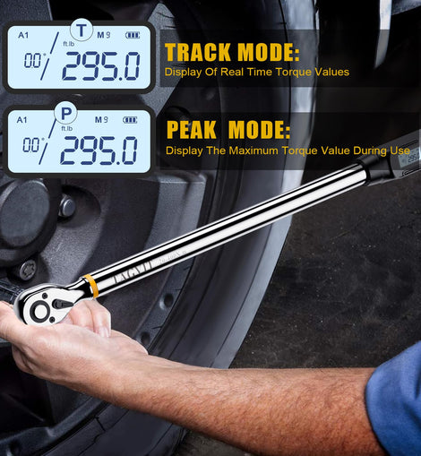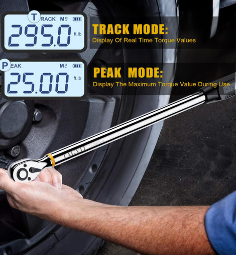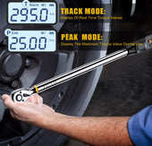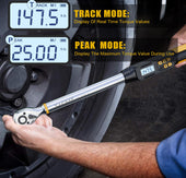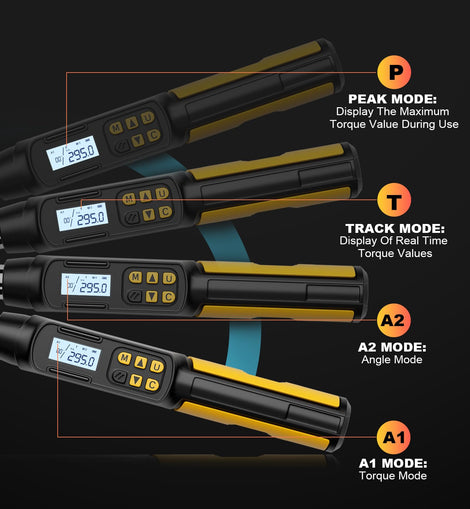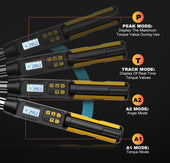 • 【Four Measurement Modes】The angle digital torque wrench has TRACK mode and PEAK mode, Torque mode (A1) and Angle mode (A2). A1 mode displays the angle value and torque value at the same time, and the alarm is mainly based on the torque value, and A2 mode jumps to the angle to start tightening after reaching the preset torque value, and the alarm is mainly based on the angle value. By quickly switching between the four modes of A1&TRACK, A1&PEAK, A2&TRACK and A2&PEAK, it can meet your different needs and usage habits.