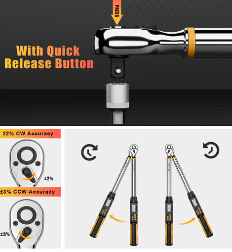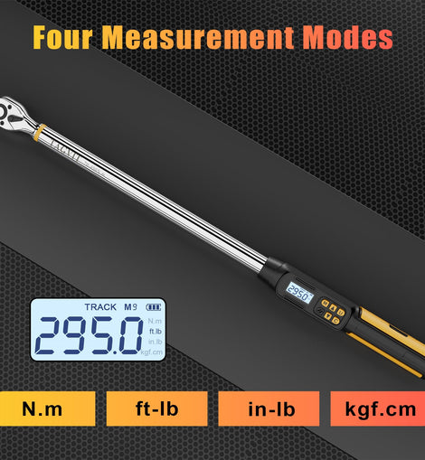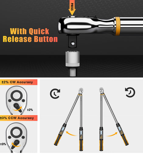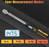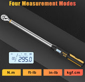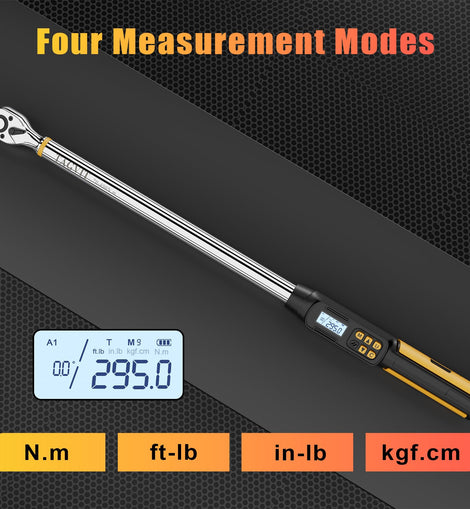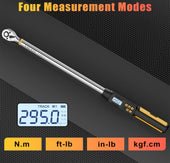 • 【Four Torque Measurement Units】This 1/2 inch drive digital torque wrench can measure from 14.75-295ft-lbs./20-400Nm, with easy to read LED display, available in Nm, Ft-lb, In.lb, Kgf.cm four measurement value switching, can adapt to the application of different torque unit measurement. The angle digital torque wrench has an accuracy of ±2% clockwise and ±3% counterclockwise. Comes with a calibration certificate and conforms to ISO 6789 and ASME B107.14M standards.