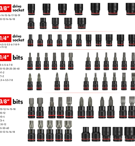 • 2.Complete 68PCS All-in-One Set Includes 1x 3/8" digital torque wrench, 1x 1/4" mini ratchet wrench, 28x short sockets (1/4" & 3/8"), 37x screwdriver bits (Hex, Torx, PH, PZ, SL), plus extensions, universal joints, and drive converters. Covers most applications for DIY and professional repairs