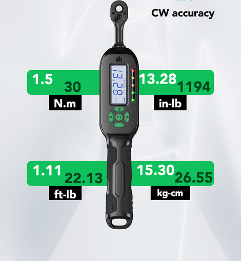 • 【Accurate measurement】The digital torque wrench has a digital display with an accuracy of ±2%, and provides four measurement modes: kg-cm, Nm, in-lb, and ft-lb.